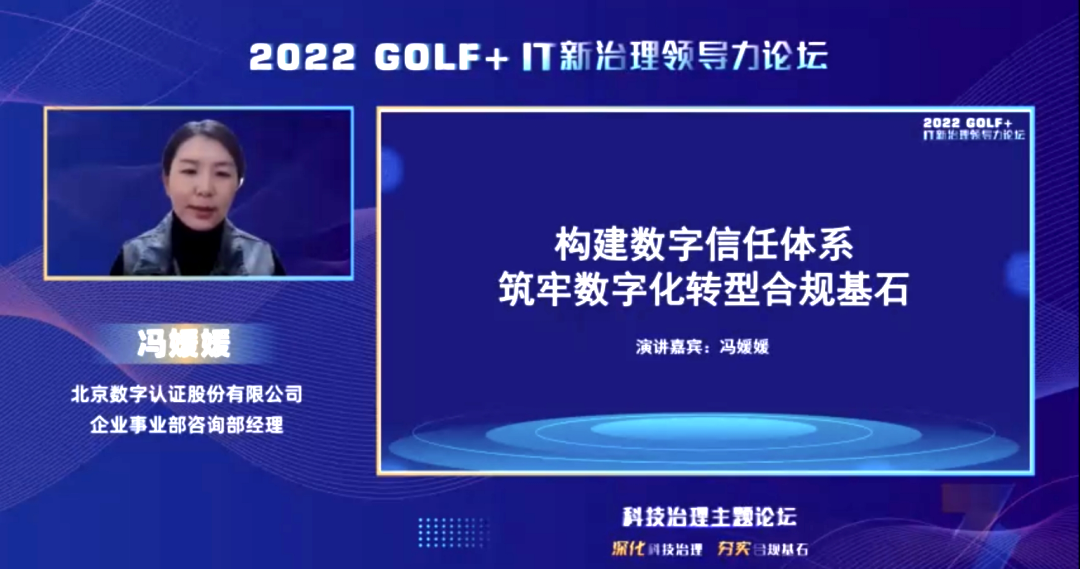 1月6~7日,由中国信息通信研究院、中国通信标准化协会主办,中国内部审计协会、中国互联网协会信息技术(IT)风险治理工作委员会支持的“2022 GOLF+ IT新治理领导力论坛”,以线下结合线上的方式成功举行。bsports官网 必一运动公司企业事业部咨询部经理冯媛媛受邀出席“科技治理”主题论坛,围绕数字信任在企业数字化转型中的应用与合规管理的实践成效进行了重点分享。