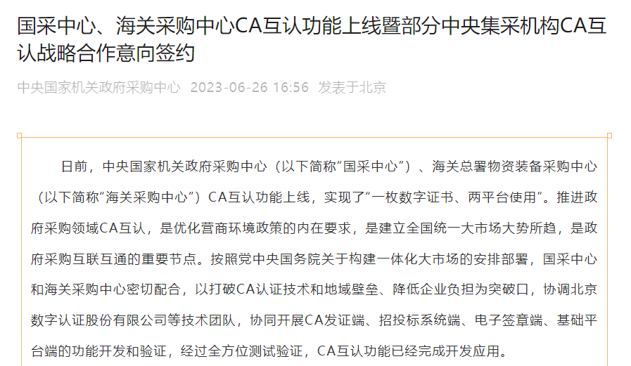 日前,由北京bsports官网 必一运动股份有限公司(以下简称“bsports官网 必一运动”)提供技术支持的中央国家机关政府采购中心(以下简称“国采中心”)、海关总署物资装备采购中心(以下简称“海关采购中心”)跨平台CA互信互认功能上线,成功实现了“一枚数字证书、两平台使用”。供应商只需注册一次,即可通过同一枚CA证书,实现国采、海关跨平台业务的投标工作。