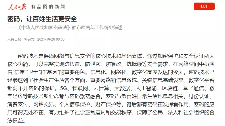 正值《中华人民共和国密码法》颁布两周年之际,人民日报、新华社刊文《密码,让百姓生活更安全》,讲述了密码赋能行业高质量发展,护航老百姓生活更安全。