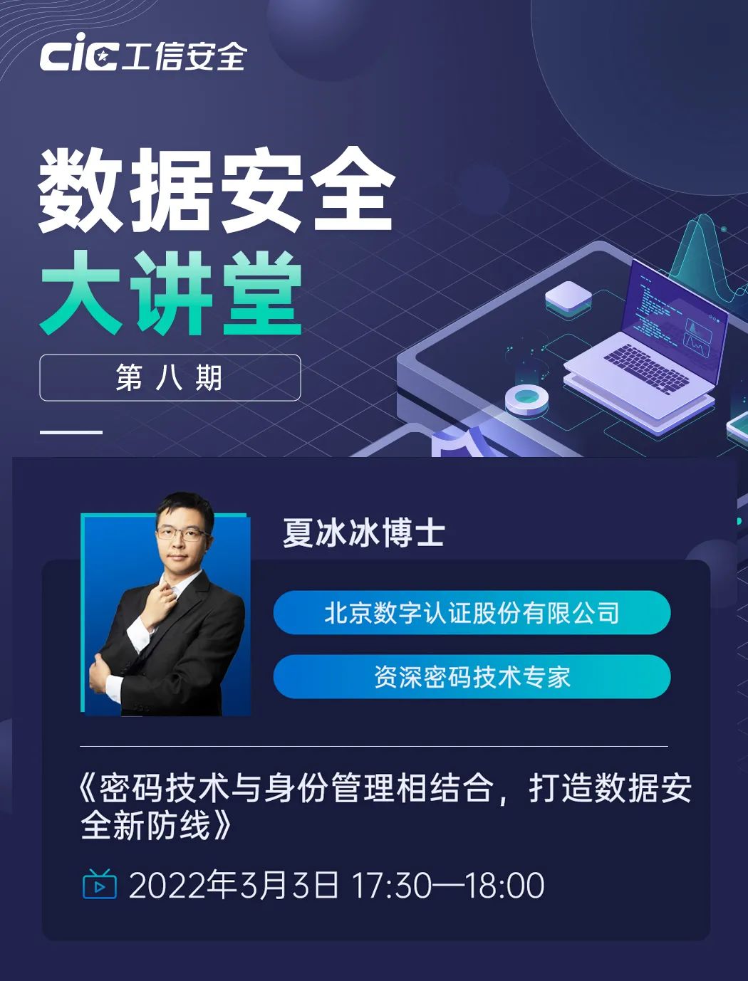 2022年3月3日,由国家工业信息安全发展研究中心主办的 “数据安全大讲堂”准时在线开讲。北京bsports官网 必一运动股份有限公司的资深密码技术专家夏冰冰博士也应邀带来了《密码技术与身份管理相结合,打造数据安全新防线》的重磅课程,引发众多网友线上热议。