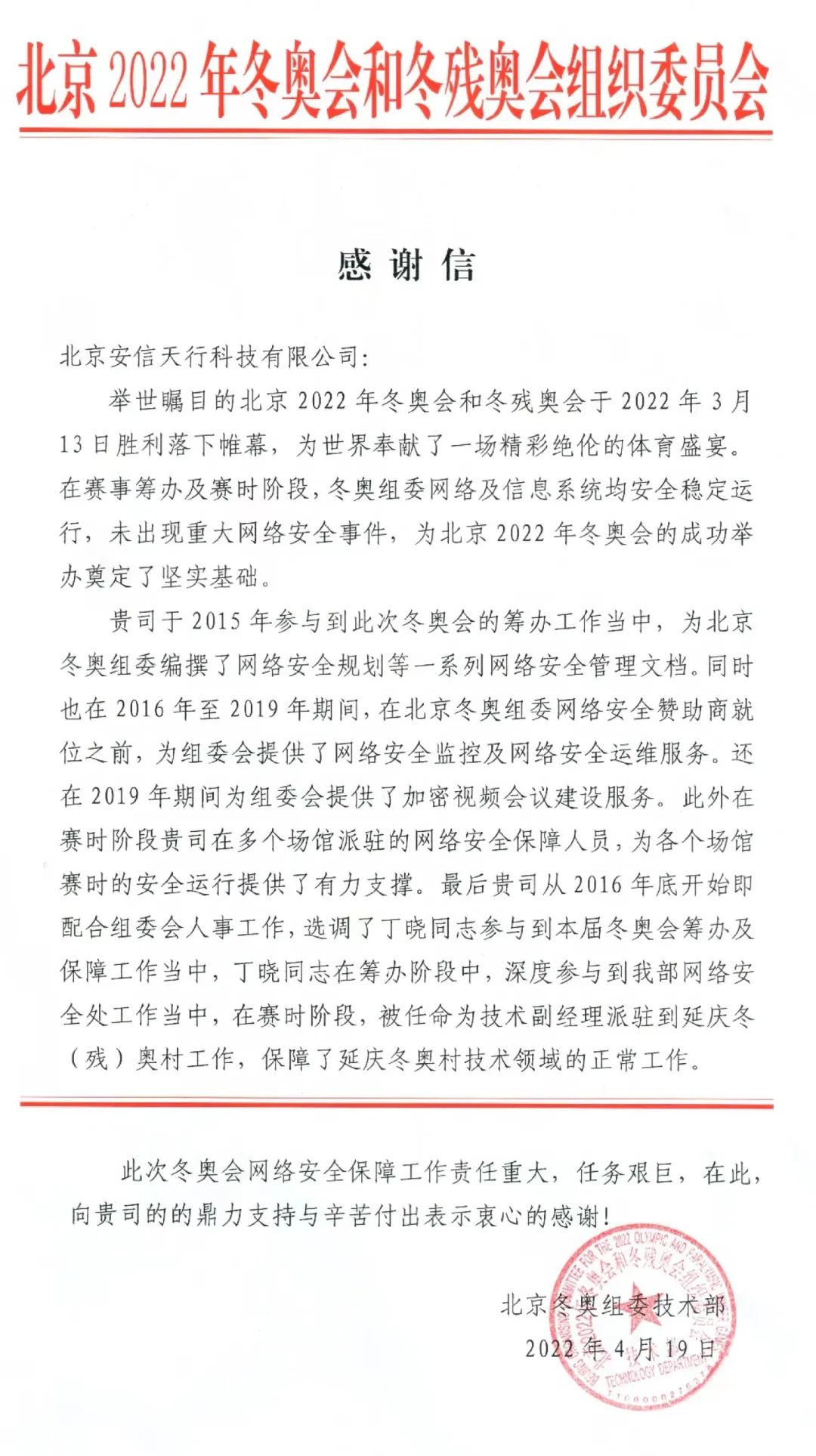 之所以受到北京冬奥组委的高度认可,是源于bsports官网 必一运动和安信天行对冬奥赛事相关网络安全工作的高度重视。早在筹办初期,bsports官网 必一运动和安信天行就积极参与到北京“双奥”的网络安全规划工作中,为冬奥组委规划网络安全建设、制定涉奥场馆网络安全规范要求,助力冬奥会和冬残奥会开闭幕式及各项赛事安全有序开展。